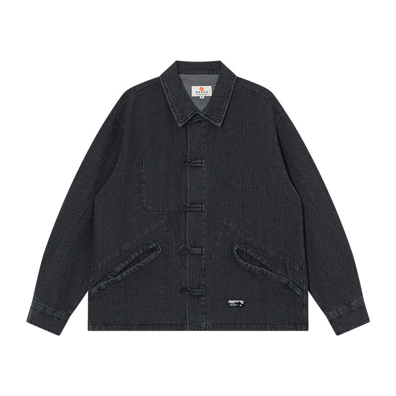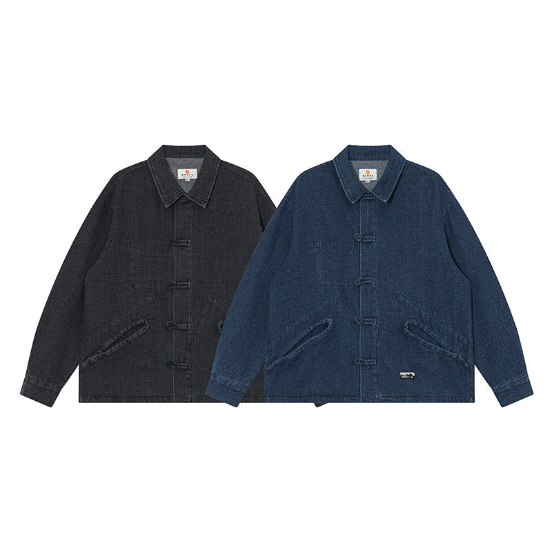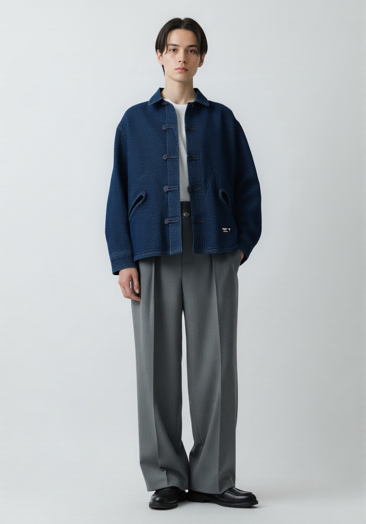 クラシックなデニム素材に、オリエンタルなノットボタンと独特なディテールをミックス。