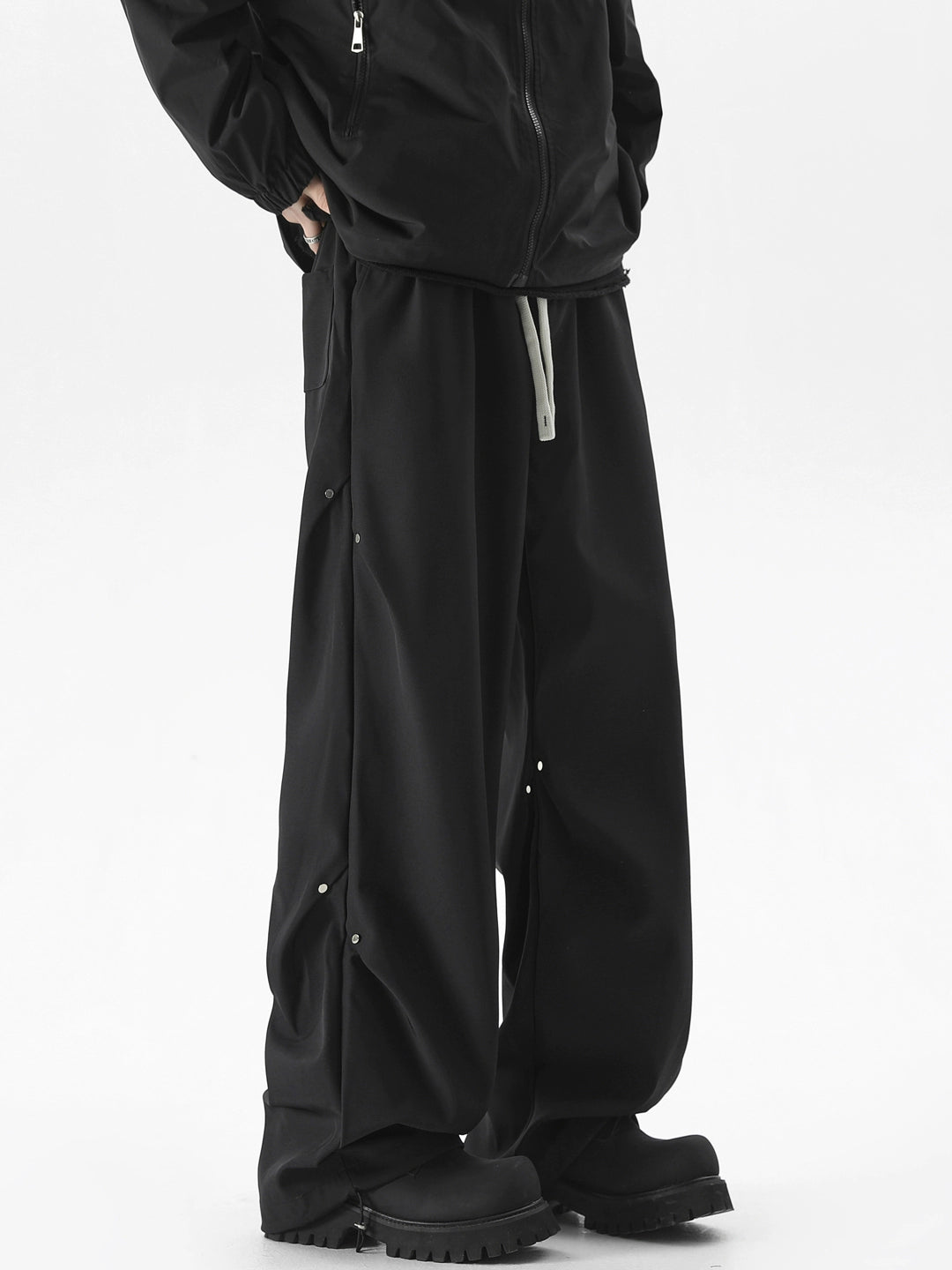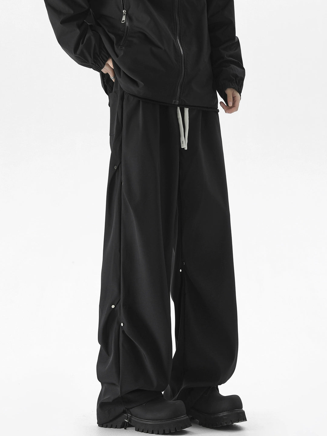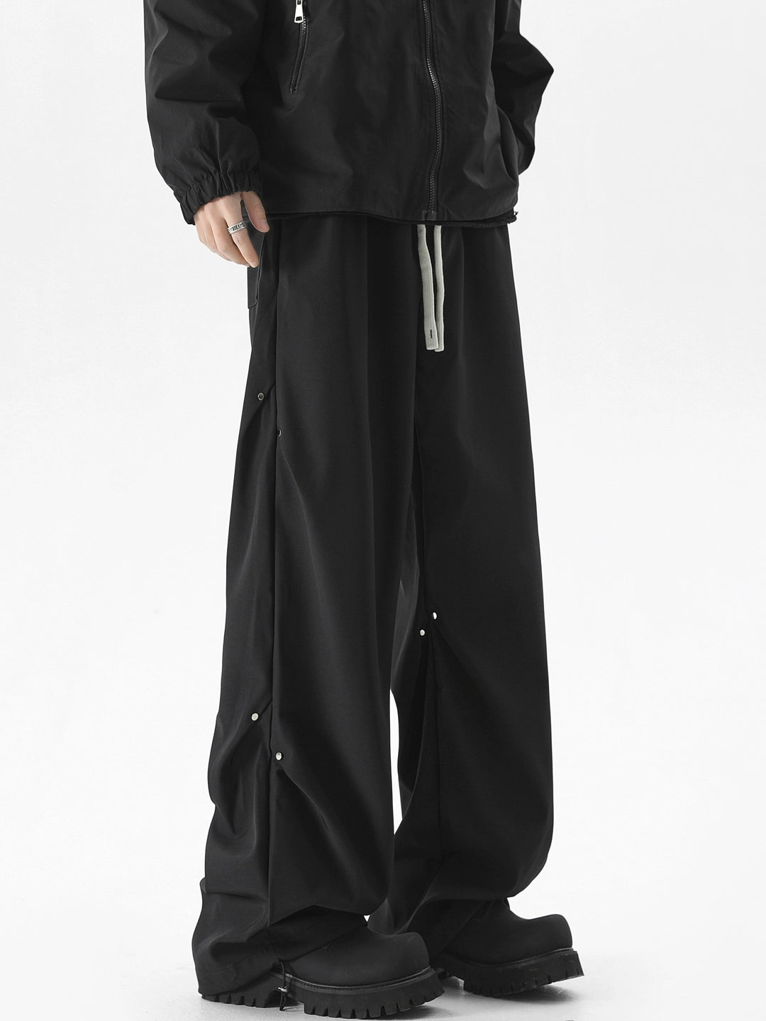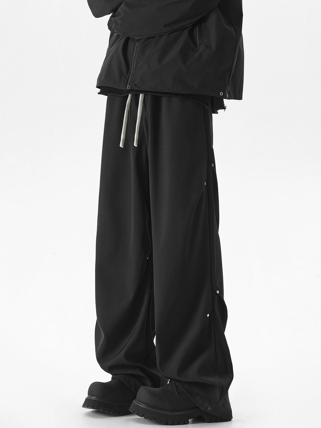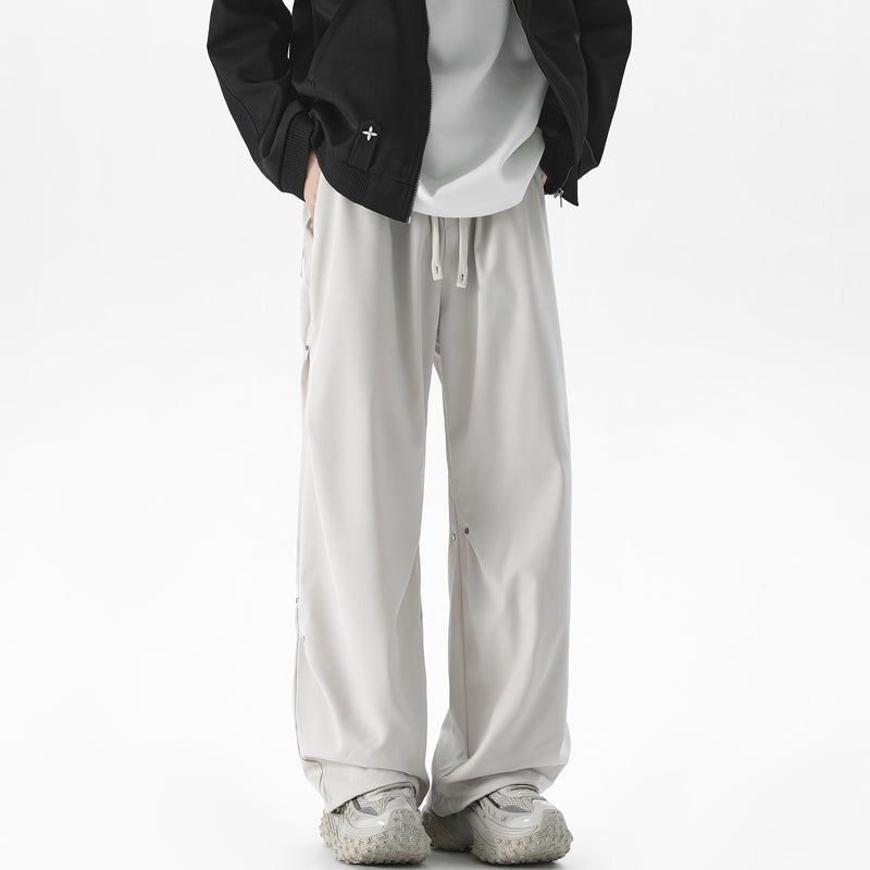 脇線に配した小さなメタルディテールがさりげなく光り、シンプルでも存在感のあるワイドストレート。