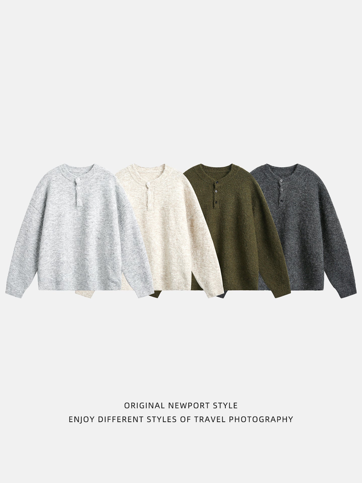 襟元にボタンをあしらったヘンリーネックデザインが特徴の、ふわふわとした起毛素材のニットセーターです。