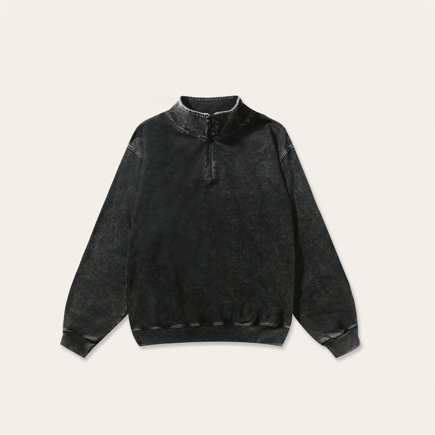 ヴィンテージライクなウォッシュ加工を施したスタンドネックのハーフジップスウェット。
