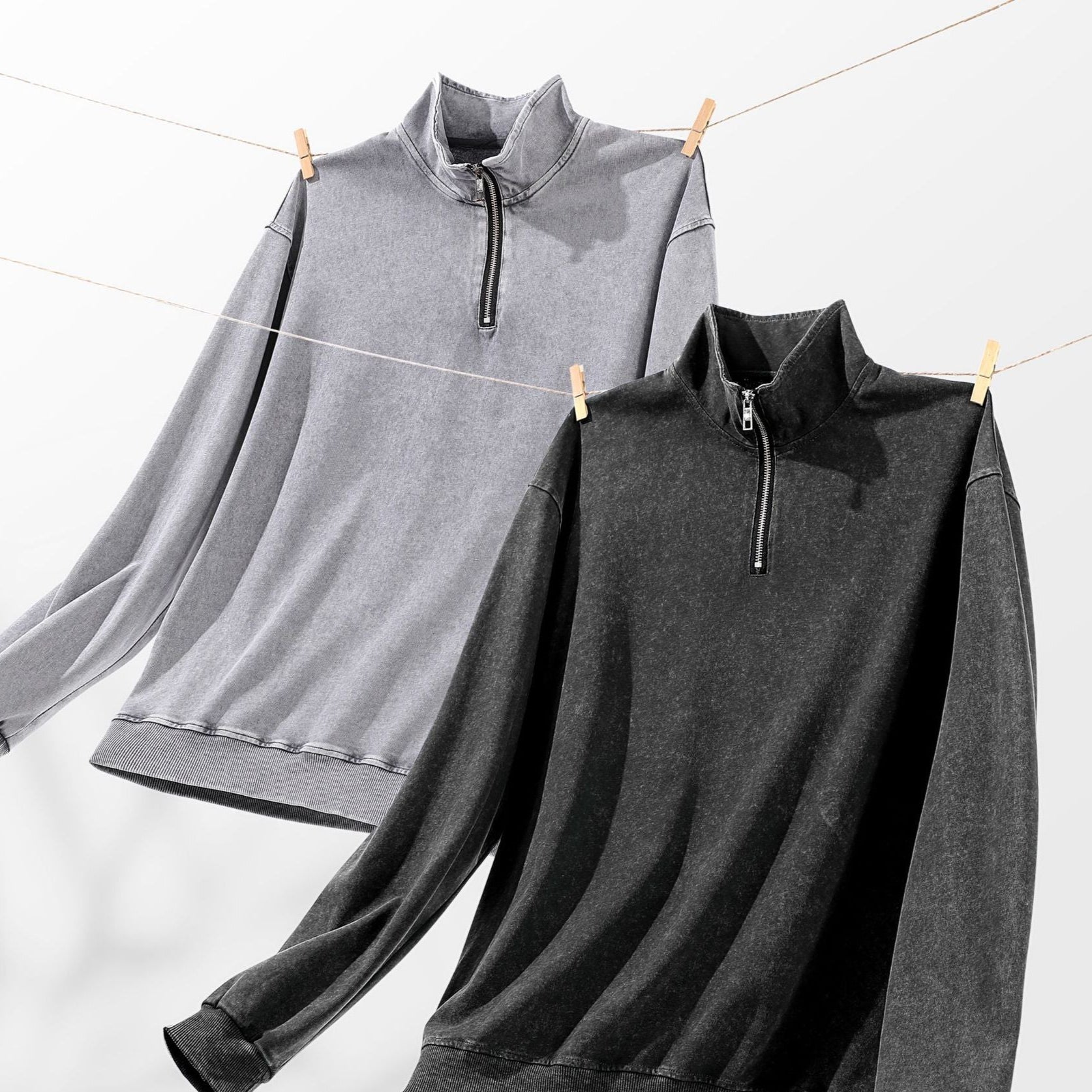 洗いの風合い×ハーフジップで、こなれ感をつくる一枚。