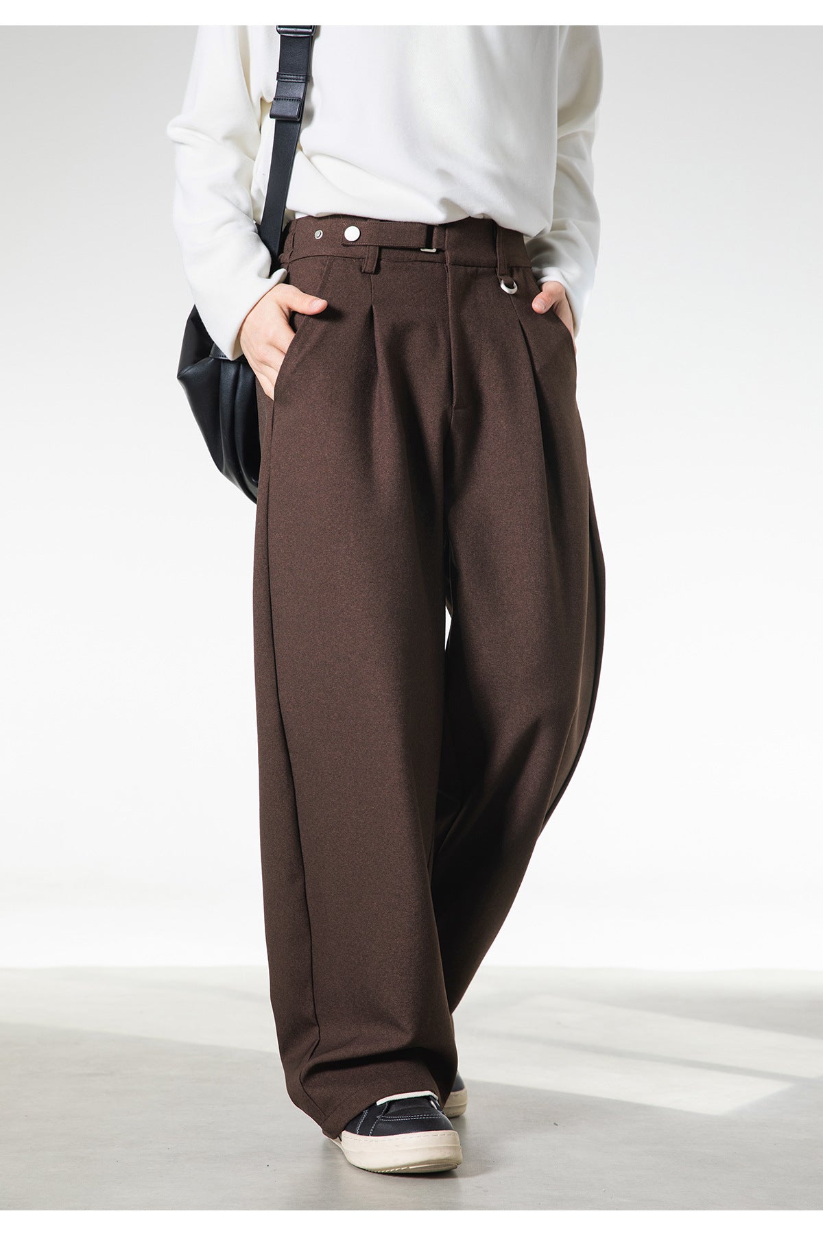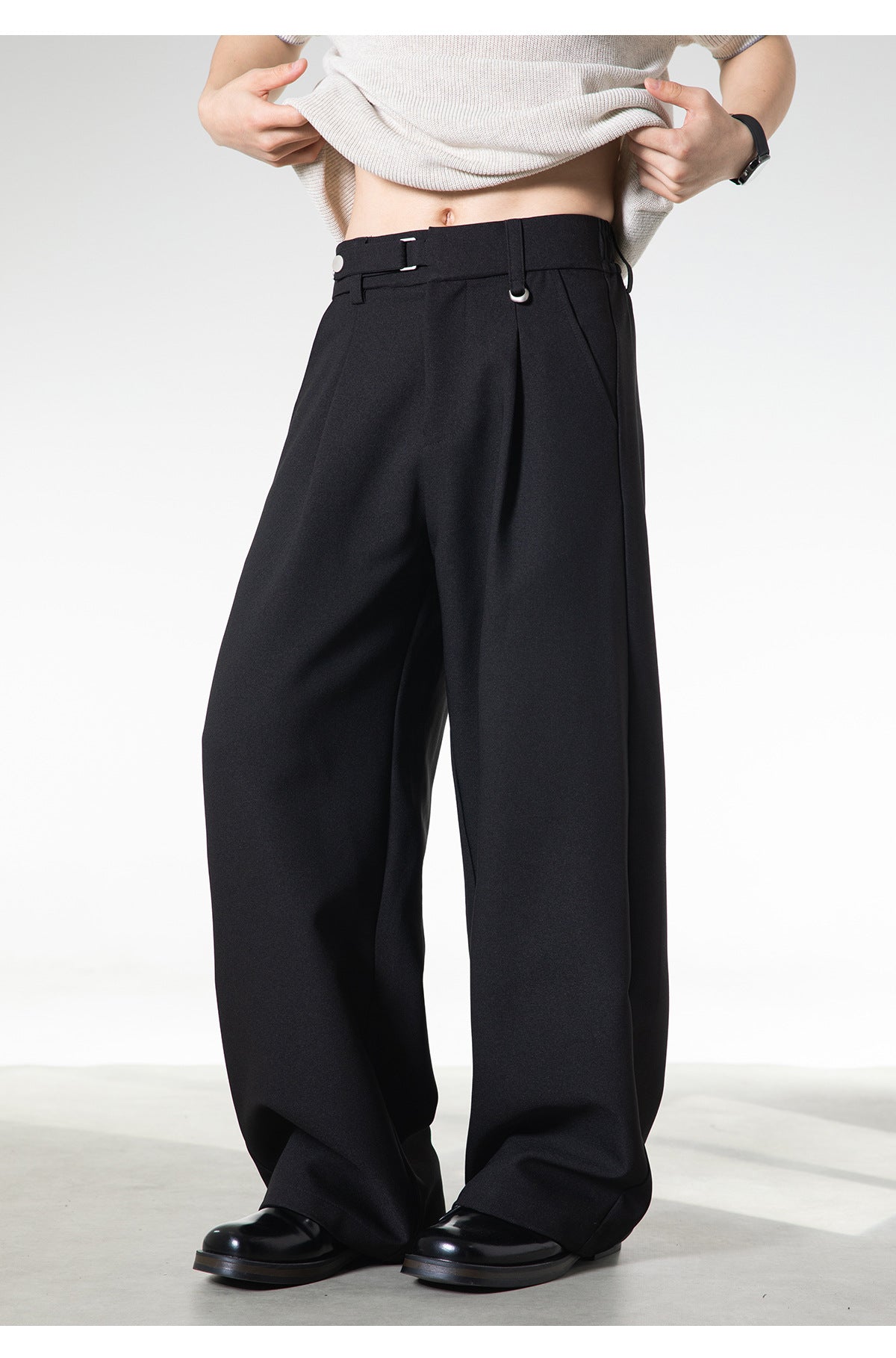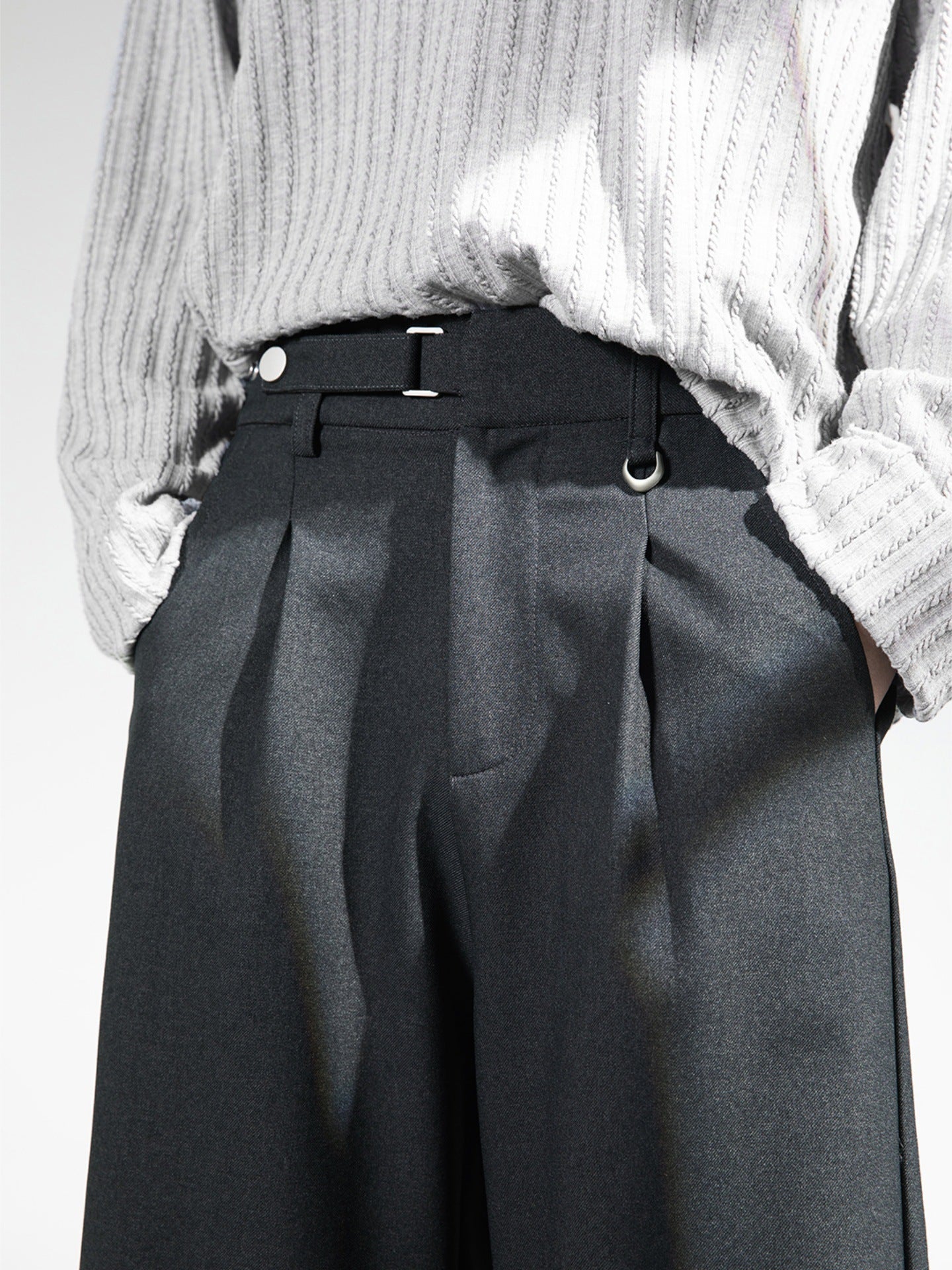 ベルトレスで決まる洗練された落ち感。大人の余裕を纏う、サイドベルト付きワイドスラックス。