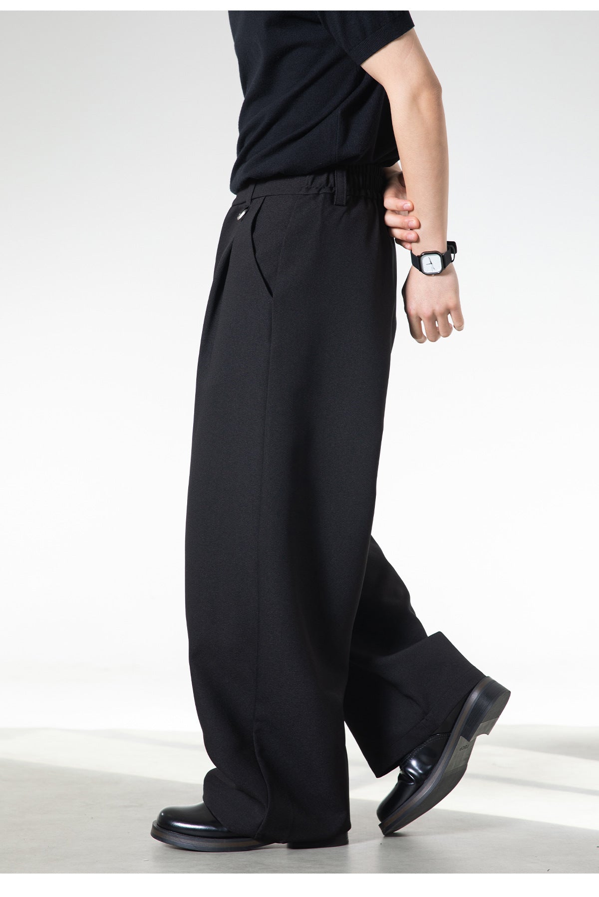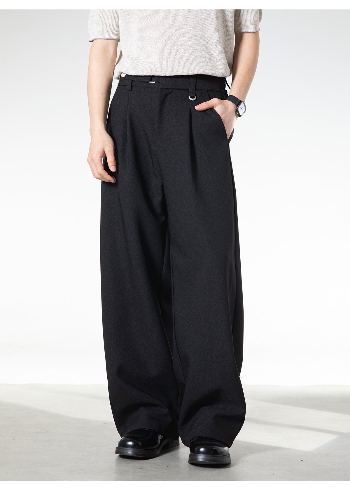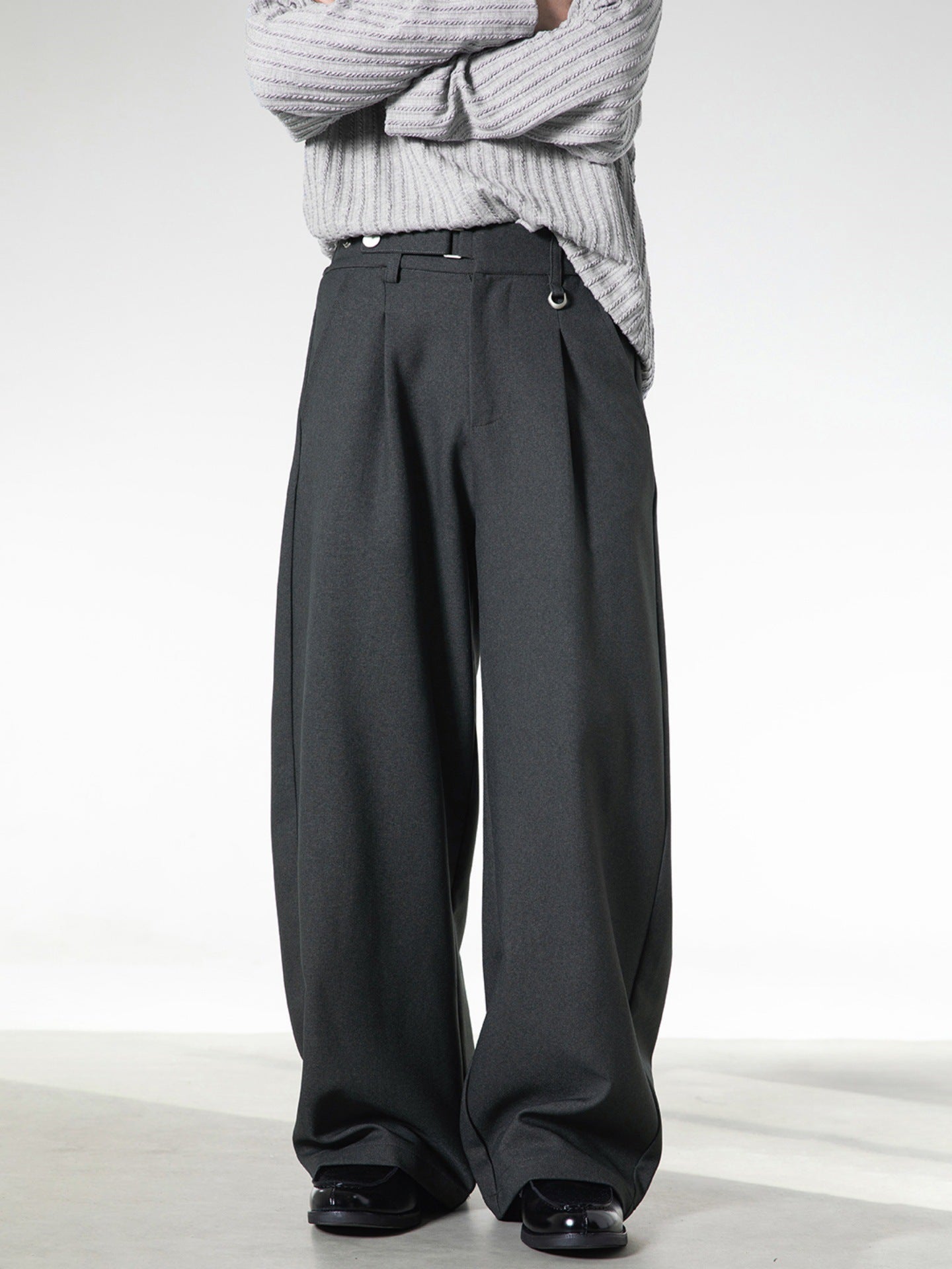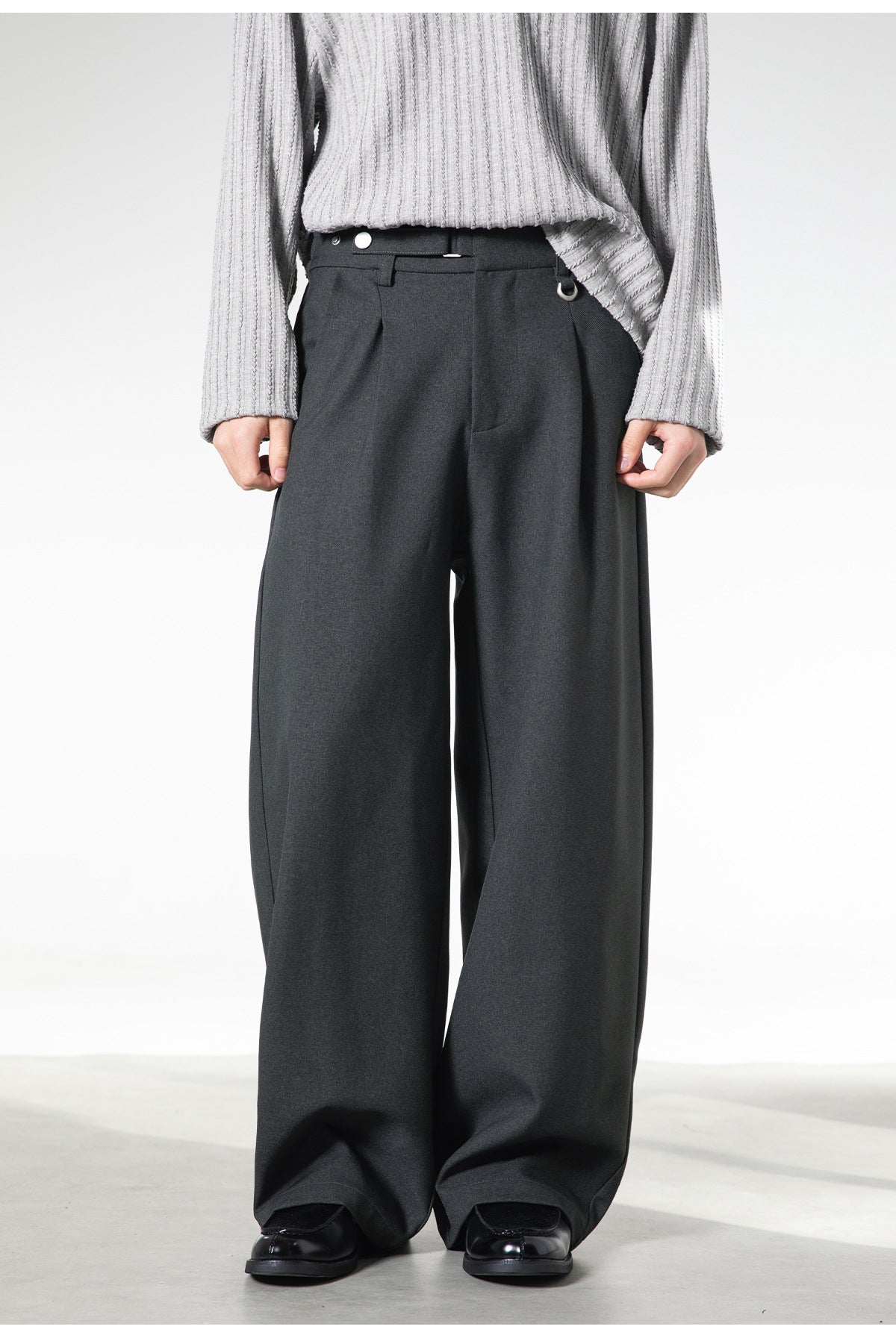 ベルトレスで決まる洗練された落ち感。大人の余裕を纏う、サイドベルト付きワイドスラックス。